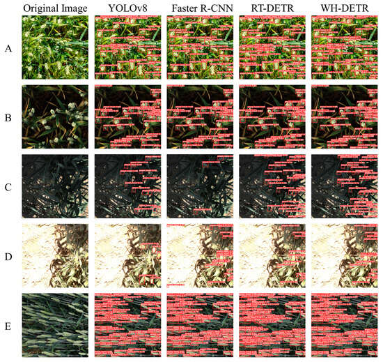 Wheat spike detection algorithm comparison: this set of images demonstrates the performance differences of the algorithm in detecting wheat spikes under various environmental conditions. (A) Depicts the detection scenario under severe background interference; (B) shows the detection outcome in sparse vegetation; (C) reflects the algorithm’s performance in low-light conditions; (D) demonstrates the detection effectiveness under strong lighting; and (E) displays the detection results in high vegetation density.