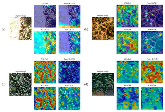 In Figure 10, we can visually examine the focal points of wheat spike detection by the WH-DETR, YOLOv8, Faster R-CNN, and RT-DETR models through a comparison of heatmaps with the original images. Notably, WH-DETR’s heatmap displayed a high concentration and precise recognition of wheat spikes, in stark contrast to the larger error hotspots of YOLOv8 and Faster R-CNN, with WH-DETR’s key target highlights being more distinct and concentrated—a visual alignment with the actual distribution of wheat spikes in the original images. This concentration indicated our model’s precision in feature extraction and accuracy in target localization. While RT-DETR showed more extensive coverage in the detection area, it appeared to be less refined in recognizing specific complex scenes. As shown in Figure 10a,c, RT-DETR struggled to accurately focus on wheat spike features within extensive detection areas, increasing the likelihood of false detections. Conversely, WH-DETR demonstrated precise attention to the areas where wheat spikes were distributed, thus achieving a higher detection accuracy. As illustrated in Figure 10b,d, WH-DETR precisely focused on scenarios where wheat spikes overlapped, enhancing detection efficiency. Although other areas received less attention, the spikes there were in less disturbed regions, making them easier to detect. WH-DETR’s heatmap not only reflects its high sensitivity to small targets against complex backgrounds, but also reveals its high specificity in target detection while maintaining a low false detection rate, a critical feature for detecting wheat spikes under dense coverage and obstructive conditions, further highlighting the significant progress made by the WH-DETR model.