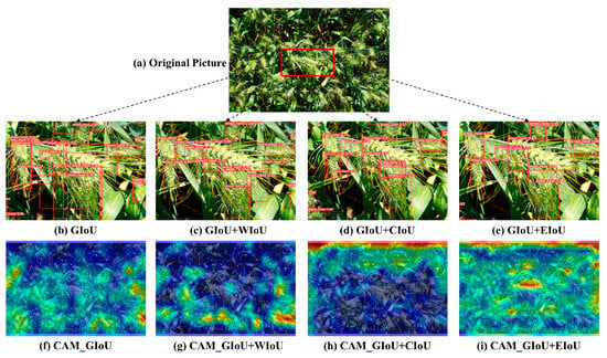 Figure 11 demonstrates the impact of different loss function combinations on wheat spike detection in scenarios with significant overlap. In Figure 11a, we selected a scene with notable overlap (indicated by the red box) for analysis. Comparing Figure 11b–e, the GIoU + EIOU combination excelled in addressing the challenge of overlap, effectively recognizing and reducing redundant detection boxes. This combination particularly stood out in the Class Activation Maps (CAMs) shown in Figure 11f–i, where it concentrated significant attention on the correct locations of wheat spikes, showcasing superior recognition capabilities over other combinations.