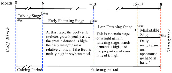 Beef Cattle Fattening Period in China. Note: * This stage pays attention to the balance of nutrition, the proportion of protein and starch is moderate, and in addition to paying attention to daily gain, it also focuses on the appearance of body and hair color.