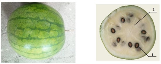 Seed melon and cross-section. (1) Melon seed; and (2) melon flesh.
