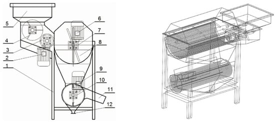The whole machine structure and three-dimensional model of seed melon crushing and seed-extraction separator. (1) Frame; (2) motor I; (3) extrusion roller; (4) seed melon crushing toothed roller; (5) feeding hopper; (6) motor II; (7) melon skin–flesh separation device; (8) melon skin outlet; (9) motor III; (10) seed–flesh separation device; (11) melon seed outlet; and (12) melon juice outlet.