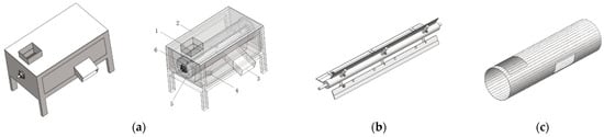 The seed–flesh separation device. (a) (1) Inlet; (2) frame; (3) melon seed outlet; (4) melon juice outlet; (5) separation screen; and (6) separation roller. (b) Separation roller. (c) Separation screen.