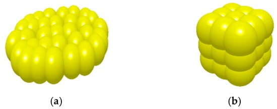 A discrete element model of the seed melon components was developed in DEM 2022. Assuming that melon seeds and melon flesh are influenced by interparticle bonding forces, their shape, and size adhere to sample statistics. They are filled with spherical particles, each with a radius of 2 mm and a radius multiplier ranging from 0.8 to 1.2. The discrete elemental model of melon seeds and flesh is depicted in Figure 4.