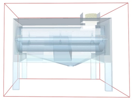 A discrete element model of the seed–flesh separation device was developed in DEM 2022, illustrated in Figure 5. The model includes essential components such as the separation rollers, screen, casing, inlet, and outlet, all fabricated from 304 stainless steel.