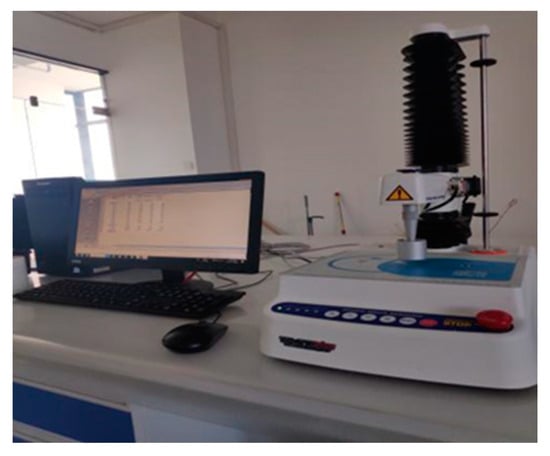 To establish an accurate discrete element model of melon seeds and flesh, test samples comprising melon seeds (200 pieces) and corresponding flesh were selected based on previous research by the group []. The flesh was then cut into small squares using a testing tool, and mechanical measurements and parameter calibrations were conducted within 12 h of specimen collection, as shown in Figure 6. The key intrinsic parameters of the specimens were determined as follows: (1) shape and size—the majority of melon seeds exhibited an oval shape, with dimensions of length, width, and thickness measured, resulting in an average size of 18.05 × 11.75 × 3.56 mm; the dimensions of the melon flesh in all directions after crushing were approximated to be 10 mm, and it was set to be a square of 10 × 10 × 10 mm; (2) density—the volume and mass were measured using the toluene specific gravity bottle method to calculate the density values of both melon seeds and flesh; (3) Poisson’s ratio and shear modulus—the TA.XT Express C-type mass tester instrument (comprising computer mainframe, monitor, knife, vernier calipers, electronic balance, hygrometer, and thermometer), shown in Figure 7, was employed to conduct tests on both melon seeds and flesh. The compression test was conducted using the P-35 compression probe of the mass tester instrument, as shown in Figure 8. The data from the compression force–time curve were analyzed using Texture Exponent software 2020 to calculate the modulus of elasticity of both the melon seeds and flesh. The puncture test was conducted using the P-2 probe of the mass tester instrument, as shown in Figure 9. The data from the shear force–displacement curve were examined using Texture Exponent software to determine the shear modulus. Subsequently, Poisson’s ratio was then calculated. Additionally, the standard material of the separation roller in the seed–flesh separation device was identified as 304 stainless steel, and its intrinsic parameters were extracted using data consultation. The above intrinsic parameters are listed in Table 2.
