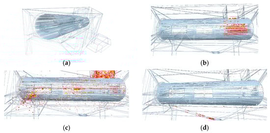 Simulation process of seed–flesh separation. (a) The initial state of simulation modeling; (b) t = 0.2 s; (c) t = 0.5 s; and (d) t = 1.0 s.