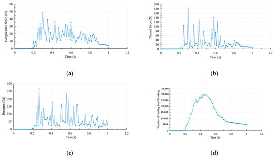 Time plot of each metric during simulation time. (a) Compression force−time curve of seed–flesh mixture; (b) parallel bond normal force−time curve; (c) separation roller scraper pressure–time curve; and (d) number of bonding bond breaking–time curve.