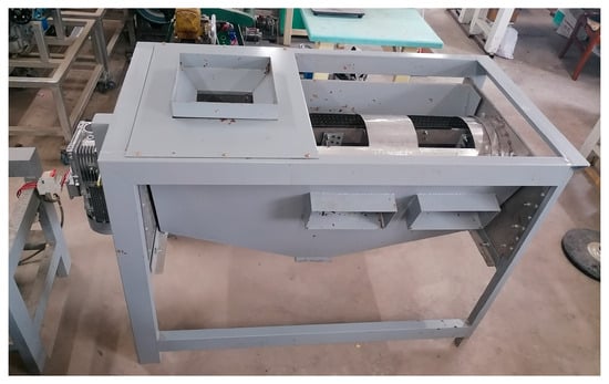 Seed melon crushing and seed-extraction separator consist of a feeding inlet, crushing and extruding device, skin–flesh separating device, seed–flesh separating device, transmission device, motor, and frame. The structure of the whole machine is shown in Figure 2.