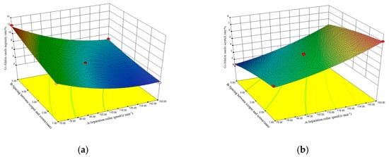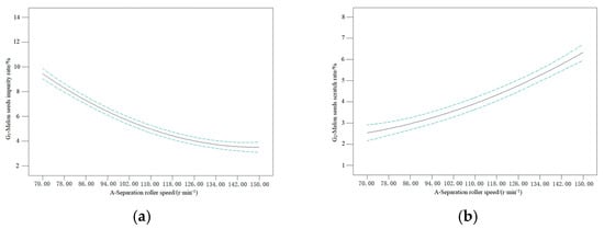 As shown in Figure 18a,b, as the rotational separation roller speed increases and the spacing between the scraper and screen decreases, the melon seed impurity rate decreases, and the melon seed scratch rate increases. This was because the elevation in the separation roller speed amplifies the force exerted by the separation roller scraper on the seed–flesh mixture, leading to a shorter duration for seed–flesh separation, thus enhancing work efficiency. Simultaneously, the reduced spacing between the scraper and screen augments the contact area between the scraper and the seed–flesh mixture, increasing the number of crushing effects on the seed–flesh mixture, intensifying the squeezing effect, and ensuring a more thorough separation, consequently decreasing the impurity rate in melon seeds. However, the increased force on the melon seeds in the mixture exposes them to greater impact, extrusion, and friction forces, while the decreased spacing results in more frequent impacts and extrusions on the seeds. Ultimately and simultaneously, this led to an increase in the number of scratched melon seeds and an increase in the rate of melon seed scratching.