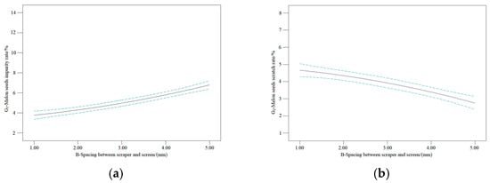 Simulation test results of the spacing between scraper and screen. (a) Trend of melon seed impurity rate. (b) Trend of melon seed scratch rate.