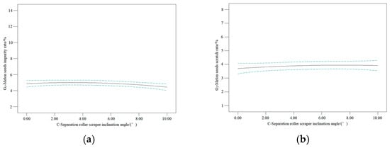 The simulation experiment was conducted in three different scenarios with separation roller scraper inclination angles of 0°, 5° and 10°. The initial motion parameters are detailed in Table 5. Figure 16a,b illustrates the trends in melon seed impurity rate and melon seed scratch rate as the separation roller scraper inclination angle increases. The analysis of the simulation results reveals, as shown in Figure 16a, that there is a subtle decrease in the melon seed impurity rate overall as the scraper’s inclination angle increases. As shown in Figure 16b, the melon seed scratch rate exhibits a slight increase with the inclination angle, eventually leveling off.