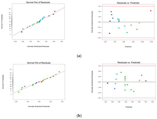 Underfitting is an indication of a poor model. If the p-value of the lack of fit is greater than 0.05, it indicates that the lack of fit is not significant. The p-value of the lack of fit for the regression model of melon seed impurity rate is 0.0648 in Table 9, and the p-value of the misfit term for the regression model of melon seed scratch rate in Table 10 is 0.0573, both of which are greater than 0.05, and the lack of fit term is insignificant, which indicates that there are no other factors in the model that have an impact on the values of melon seed impurity rate and melon seed scratch rate. The standard residual error of the regression is analyzed using Design Expert software 10, which satisfies the hypothesis of normality and normal distribution, and the variance is equal, indicating that the model is stable and valid, as shown in Figure 17a,b.