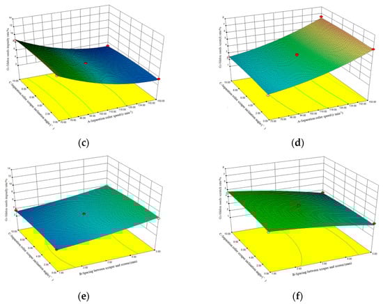 Influence of the interaction effect of the separation device working parameters on melon seed impurity rate and melon seed scratch rate. (a) Influence of separation roller speed and spacing between scraper and screen on melon seed impurity rate; (b) influence of separation roller speed and spacing between scraper and screen on melon seed scratch rate; (c) influence of separation roller speed and separation roller scraper inclination angle on melon seed impurity rate; (d) influence of separation roller speed and separation roller scraper inclination angle on melon seed scratch rate; (e) influence of spacing between scraper and screen and separation roller scraper inclination angle on melon seed impurity rate; and (f) influence of spacing between scraper and screen and separation roller scraper inclination angle on melon seed scratch rate.