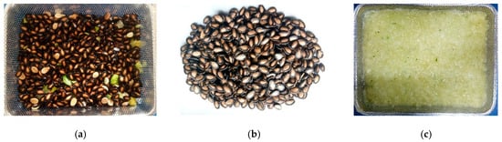 The key components of the seed–flesh separating device comprise a seed–flesh separation roller and a seed–flesh separation screen. The separation roller was comprised of the roller shaft, the support bar, and three scrapers, as shown in Figure 3b. The three scrapers are evenly distributed along the circumference of the roller shaft, with a pinch angle of 120° and a length of 1150 mm, and a 10 mm thick food-grade soft silicone pad is affixed in the center of the scrapers to reduce the likelihood of melon seed damage. The seed–flesh separation screen, designed cylindrically as shown in Figure 3c, features a screen diameter of 300 mm and an aperture diameter of 6 mm.