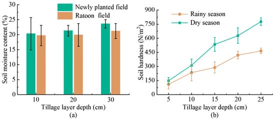 It can be found from Figure 2a that the moisture content basically slightly increases as the tillage layer deepens. However, during ridge-breaking earth cultivation operation, the water-holding capacity of ratoon fields is significantly weaker than that of the newly planted cane fields. The reason is inferred to be related to the fact that the soil layers contain a large amount of deposited fertilizer salts and organic matter produced by returning straw to the field [21]. This results in the cultivated land being more compact and possessing certain drainage characteristics. Judging from the soil hardness traversal of ratoon cane fields in different seasons, the hardness (average value of 646.7 N/cm2) in the dry season is significantly greater than the value (392.4 N/cm2) in the rainy season. Overall, the hardness range of a ratoon field is significantly larger than that of other crops [22]. This soil texture becomes progressively compact and viscous with increasing depth. As a result, this characteristic increases the design requirements for the cultivator to break up hardened layers and agglomerated soil. Improved soil fragmentation is important for seedling emergence after ridge coverage and the filling ability with plow push.