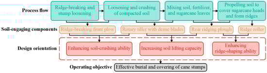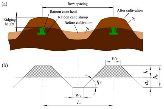 Sugarcane is a perennial ratoon crop. In Guangxi Province, the main sugarcane-producing area in China, cultivation mostly follows a circular planting model. In this model, new planting is implemented in the first year. Over the following 2–4 years, the sugarcane stumps remaining in the field after harvest are reused for new sprout growth. Therefore, annual field management of ratoon sugarcane is crucial, with earth cultivation being a key component. The cultivated ridges can increase the depth of root system into the soil and reduce the lodging of tall stems. As a result, root growth is promoted, ineffective tillering is inhibited, and the yield of ratoon sugarcane is enhanced [1,2]. Recently, efforts have focused on reducing the compound costs of various field management operations while improving planting quality. Based on the technological requirements for simple and efficient sugarcane cultivation, the operating procedures for ratoon cane cultivation were reintegrated. A combined agronomic method for ratoon cane fields was proposed, which could accomplish ridge-breaking, loosening, fertilization, and earth cultivation in one go [3]. This new agronomic method eliminates the need for fertilization and tillage during subsequent seedling growth, allowing for a more concentrated and compact farming schedule. Additionally, it offers advantages such as reduced risks of drought, rot diseases, and frostbite caused by exposed ratoon stumps. Heat preservation, anti-freeze measures, and water retention aim to promote the germination and root development of low-position buds [4,5]. This further reduces the problem of pulling out cane stumps during mechanical harvesting. In terms of the timing of agronomic implementation, ridge-breaking earth cultivation is generally scheduled after chopping leaves and cutting stubble. Therefore, the cultivated soil should fully cover the heads of the originally exposed cane stumps. This means that a certain thickness of soil coverage is required for effective filling.