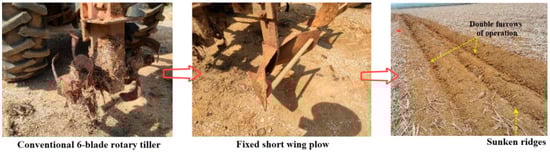 - Taking the gradient terrain of ridges and furrows with a row spacing of 1.4 m as the work object, it has integrated functions of effectively performing ridge breaking and soil lifting. Additionally, it can crush, mix, and raise ridges, forming a small and intensive structure [23].
