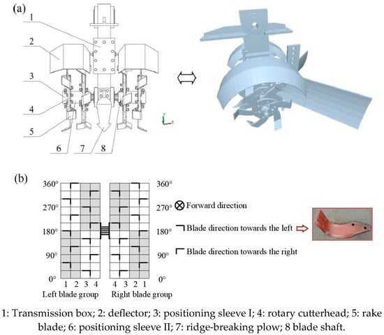 In the study of hilly machinery that combines different crops and their agronomic characteristics, Lv et al. [9] developed a potato cultivator suitable for a row spacing of 1.2 m. This machine is capable of increasing soil breakage rate and weeding, fertilizing, and cultivating soil simultaneously. Kudzaev et al. [10] proposed an earth cultivator with closed-loop elastic suspension to reduce the forward working resistance under stony soil conditions and improve the reliability of working depth. Using full-film and double ridge–furrow sowing technology, Zhang et al. [11] developed a tiller for loosening soil, weeding, and raising ridges before crop growth. This tiller can be adjusted to meet the requirements of different ridge widths and heights. In order to solve the problems of poor ridge quality and difficult-to-control shape, Zhang et al. [12] proposed a spiral composite tobacco cultivator that can realize upward transportation of soil and control of the ridge shape. In addition, Yuttana et al. [13] designed a tractor-pulled inter-row shredder for loosening and crushing soil during cultivation at the seedling stage. Liu et al. [14] developed a diamond-shaped, four-wheel sugarcane fertilizing and cultivating machine. With its large ground clearance, this machine is suitable for earth cultivation during the sugarcane seedling jointing stage, thereby extending the window period for intertillage operations. In summary, existing soil cultivation tools are mainly aimed at traditional soil loosening and ridging agronomy [15]. However, given the working conditions of ratoon cane fields and the new agronomic adaptability requirements for ridge-breaking earth cultivation, suitable mechanical operation methods are lacking. These methods should combine ridge breaking, loosening, and soil–leaf–fertilizer mixing effectively.