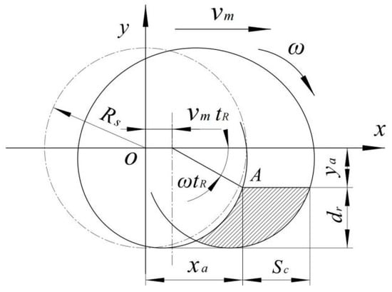 To achieve better cutting and burying effects while minimizing torque resistance, especially when cane leaves cover the ground, the forward rotation method is used for rotary tillage [25]. The process of the blade cutting the soil involves compound motion; thus, a single blade is used as the object of kinematic analysis. Taking the forward direction of the machine as the positive x-axis, an Oxy rectangular coordinate system with the blade shaft center as the origin is established, as shown in Figure 7. The motion trajectory of the blade tip point (A) can be regarded as a mathematical cycloid composed of rotation and linear motion, and its equation can be expressed as: