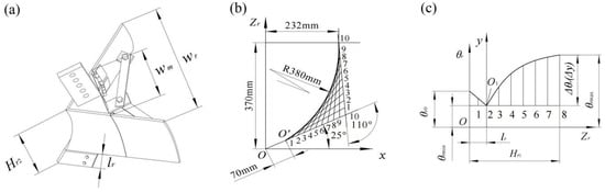 Therefore, the relationship between θr and the height Zr of the horizontal linear element is shown in Figure 8c. Thereinto, in order to balance the soil breaking and turning performance of the plough, θro is 37.5°, θrmin is 36.5°, and θrmax is 40°, respectively [29]. Then, the determined change equation of element line angle is: