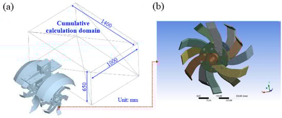 DEM calculation model. (a) The setting of the throwing mass calculation domain. (b) Rotary blade group for finite element calculations.
