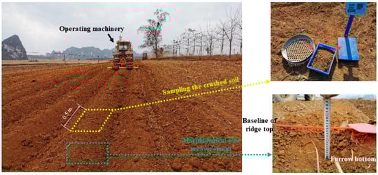 A prototype of ridge-breaking earth cultivator was manufactured and equipped with 12 rake blades on each side of the dual rotary tillers. Field experiments were conducted in Fusui County, Chongzuo City, Guangxi Province, to test the actual working effect compared with the original cultivator. This field is located in the main advantageous sugarcane production area in South China, with typical climate, terrain, and soil conditions. Field operations were carried out in winter. At the required tillage depth of 20 cm, the soil parameters of the experimental plot were measured on site: the soil moisture content was 14.34% and soil hardness was 628 N·min−1. These soil parameter conditions were verified to be consistent with the characteristics of ratoon sugarcane fields previously described. As shown in Figure 10, the planting row spacing of 140 cm also meets the design specifications of the machine.