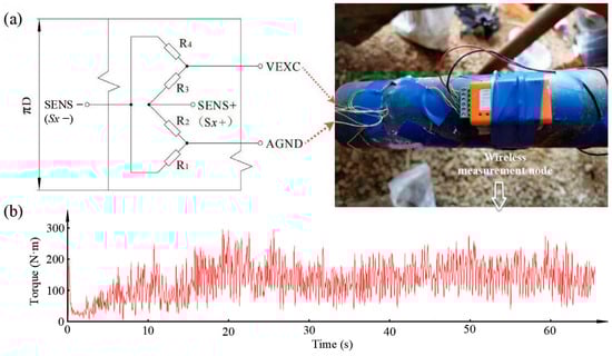 Detection method and dynamic data of rotary tillage torque. (a) Measurement circuit and wiring. (b) Measured torque curve.