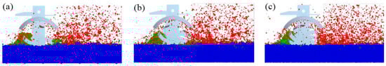 Figure 12 shows the simulation of the interaction between rotary tillers, equipped with 4, 8, and 12 rake blades per cutterhead, and the soil. The red–green–blue color sequence represents decreasing particle motion speed. The simulation clearly shows soil particles being lifted, accelerated, and thrown backward. By comparing the particle flow effects among different blade groups, it is evident that the soil cutting and throwing effects are most pronounced in the case of 12 blades. This configuration shows the highest number of particles in red.
