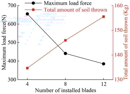 Furthermore, from the steady-state operation, the maximum instantaneous force on a single rake blade and the total mass of soil thrown backwards were extracted. The correlation curves between the number of installed blades and these values at a forward speed of 0.9 m·s−1, a rotary speed of 300 r·min−1, and a cutting depth of 200 mm are shown in Figure 13. As the number of blades increases, the load level on the blades decreases significantly, and the amount of soil thrown increases significantly. This indicates that the dense blade arrangement design with a maximum of 12 blades on one side is beneficial for improving the load-bearing reliability of rotary tiller components. The principle behind this improvement is to reduce the cutting pitch reasonably, thereby providing more soil for subsequent ridging.