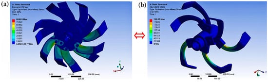 Comparison of equivalent stress distribution. (a) Improved cutterhead structure. (b) Original cutterhead structure.
