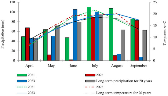 Rainfall totals and average air temperatures during the soybean growing season are provided according to data from the Subcarpathian Agricultural Advisory Center in Boguchwała. The weather station was located next to the experimental field. Weather conditions varied during the study years. High precipitation was recorded in August 2021 compared to the long-term average (2001–2020). In contrast, low precipitation occurred in May, June, and August 2022, as well as August and September 2023. Air temperatures in April each year were below the long-term average. High temperatures were recorded in May, June, and August 2022, as well as in July 2021 and September 2023 (Figure 1).