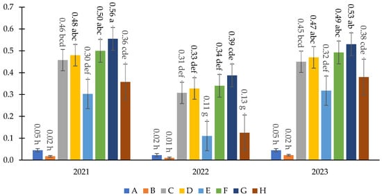 The combined application of seed inoculation with nitrogen fertilization yielded comparable results to a double dose of inoculant. Therefore, it has been demonstrated that nitrogen mineral fertilization can be substituted with an increased dose of inoculant. In the years 2021 and 2022, nitrogen fertilization (without seed inoculation) resulted in a significant increase in yield, but only compared to the control plants. Meanwhile, nitrogen fertilization was unfounded in 2023 (Figure 4).