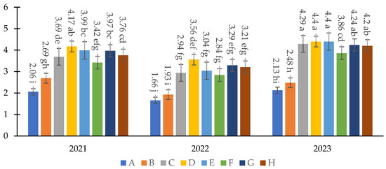 The plant density before harvest was not altered by the experimental treatments, but it varied across the study years. The lowest plant density per square meter was recorded in 2022 (Table 2).
