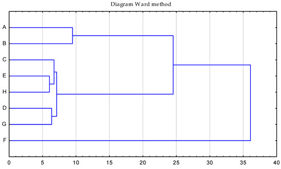 Dendrogram similarity of the inoculation and/or nitrogen fertilization. A—control (without inoculation and nitrogen fertilization), B—nitrogen fertilization at a dose of 30 N kg ha−1 (without inoculation), C—inoculant—HiStick® Soy, D—inoculant—HiStick® Soy in a double dose, E—inoculant—HiStick® Soy + nitrogen fertilization at a dose of 30 N kg ha−1, F—inoculant—TURBOSOY®, G—inoculant—TURBOSOY® in a double dose, H—inoculant—TURBOSOY® + nitrogen fertilization at a dose of 30 N kg ha−1.
