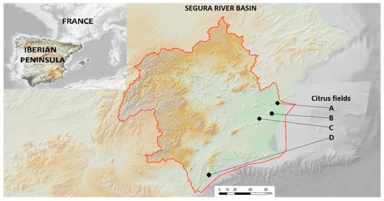 The SRB contains 261,626 ha of irrigated agricultural fields, of which 27.9% are citrus crops [31]. The climate in the region is semi-arid, characterized by warm, dry summers and mild winters. The average annual reference evapotranspiration (ET0) is 1100 mm, and the rainfall is 400 mm. Despite periodic water scarcity, irrigation adequately satisfies crop water requirements. This is often facilitated by the accumulation of water in reservoirs during prolonged dry periods, thanks to the allocation of water from the central region of the country via the Tagus–Segura water transfer.