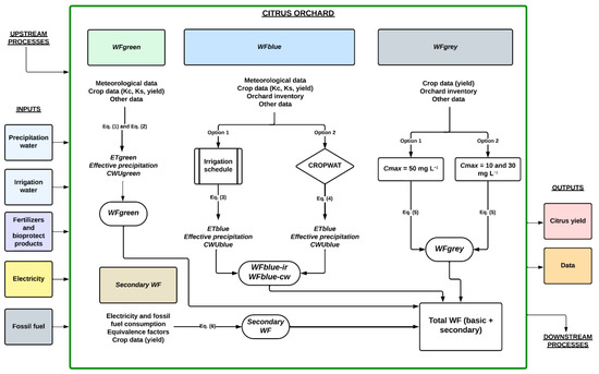 The direct WF assessment followed the methodology outlined in the WFN guidelines [1]. The three components were determined monthly using local data, including information from public meteorological stations and farmer’s fieldnotes, while secondary WF from electricity and fossil fuel consumption was estimated following comprehensive literature suggestions.