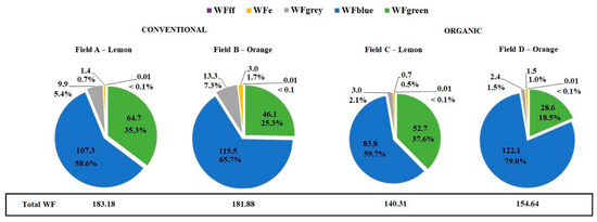 Recent research by Kowalczyk and Kuboń [23] found that the WF of organic carrot farming was over five times lower compared to conventional production, owing to the significant impact of fertilization and pesticide products. In our study, the total WF was approximately 30% higher in the conventional plots, with the grey component being three to six times higher in lemon and orange, respectively, compared to the organic production. These findings suggest that figures may vary significantly among species and cropping systems, emphasizing the need for further research on the impact of organic agriculture on the WF.