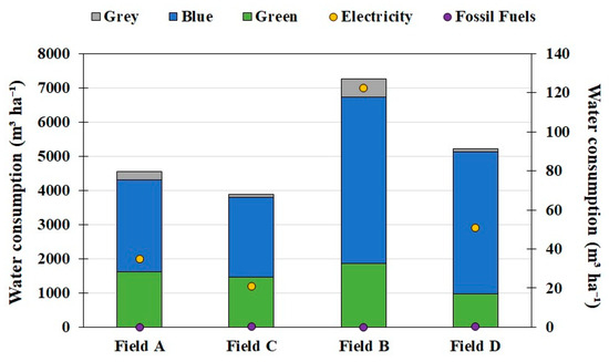 Water usage (m3 ha−1) associated with the green, blue, and grey water footprint (Y-axis) and derived from electricity and fossil fuel consumption (secondary Y-axis), calculated using the field irrigation program for the blue water footprint (WFblue-ir) and 50 mg L−1 of maximum nitrogen concentration allowed, as used in Equation (5).