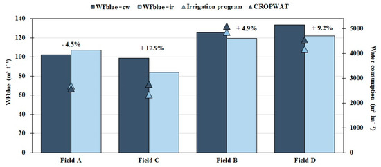 Comparison of water consumption (m3 ha−1, triangles) and the blue water footprint (m3 t−1, bars) using the irrigation program performed in the field and CROPWAT software for each plot.