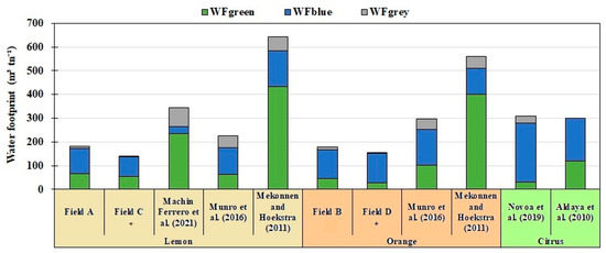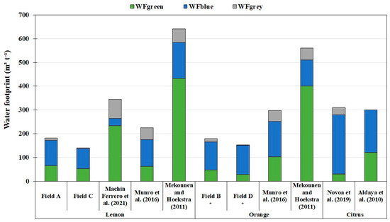 Global comparison of the direct water footprint (green, blue, and grey) estimated for various citrus productions by Mekonnen and Hoekstra [1], Machin-Ferrero et al. [7], Munro et al. [20], Novoa et al. [21] and Aldaya et al. [56]. For fields A–D, the blue water footprint considering the irrigation program and 50 mg L−1 as the maximum nitrogen concentration allowed were used. * Organic plots.