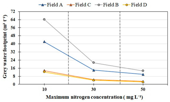 Variation in the grey water footprint (m3 t−1) in fields A–D depending on the maximum nitrogen concentration (mg L−1) used for calculations in Equation (5).