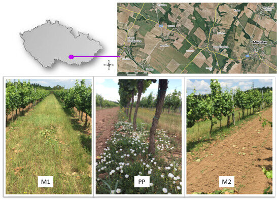 The selected vineyards are located on the edge of the Dyjskosvratecký Valley in South Moravia (Czech Republic). The altitude ranges between 240 and 320 m. The average annual temperature is 8.5 °C, and the annual rainfall is 470 mm. These data were taken from the nearest meteorological station of the Czech Hydrometeorological Institute in Kuchařovice [55,56,57].