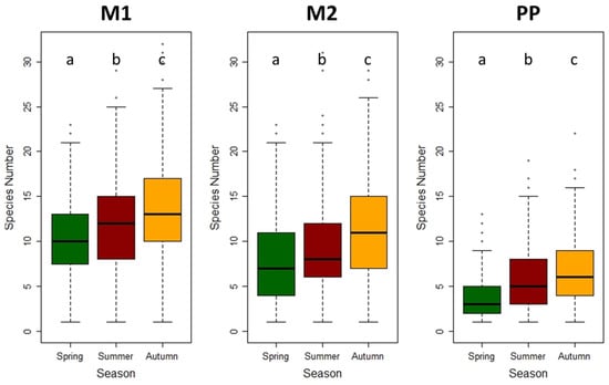 The box and whisker plots present the number of species in the phytosociological relevés. Individual seasons of the year are presented separately, and the differences are tested using the Kruskal–Wallis test (the letters above the boxes show the statistically significant results). Variants: M1 = grassy inter-row; M2 = cultivated inter-row; and PP = stripe below the grape trunks.