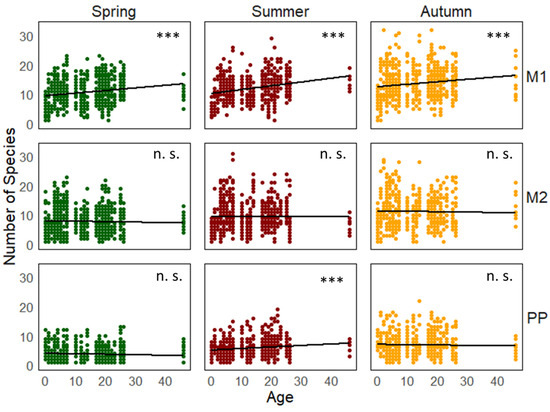 The relationship between the number of plant species and the age of the vineyards (years after establishment). The variants include M1 for grassy inter-rows, M2 for cultivated inter-rows, and PP for stripes below the grape trunks. The asterisks (***) denote significant changes in species numbers when comparing vineyards with different establishment times (n. s.: M2 spring p = 0.18; M2 summer p = 0.13; M2 autumn p = 0.15; PP spring p = 0.11; and PP autumn p = 0.12).