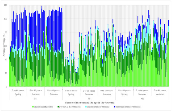 The coverage development of the plant groups according to the length of the growing season and botanical division is shown in Figure 4. The representation of the plant groups changed with the age of the vineyard, the season, and the type of inter-row.