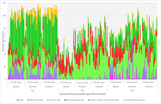 The development of the coverage of the plant groups according to the functional groups is shown in Figure 5. In vineyards up to 4 years of age, there was an increase in the coverage of representatives of the Fabaceae family, entomophilous plants, and species with an anti-erosion effect in the grassy inter-row (M1). There was a significant difference in the coverage of plant groups between the seasons. During the spring, the coverage of the group of deep-rooting species was dominant. During the summer, the coverage of annual weeds decreased. In the older vineyards, the coverage of annual weeds increased in the cultivated inter-row (M2). There was a high coverage of the group of crops and representatives of the leguminous family.
