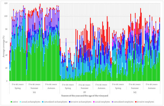 The development of plant group coverage according to origin and invasion status is demonstrated in Figure 6. The high coverage of species from the invasive archaeophyte group and invasive neophyte group was mainly in the strip area around the grapevine trunks and in the cultivated inter-row (M2). Indigenous plant species had the least coverage in these habitats.