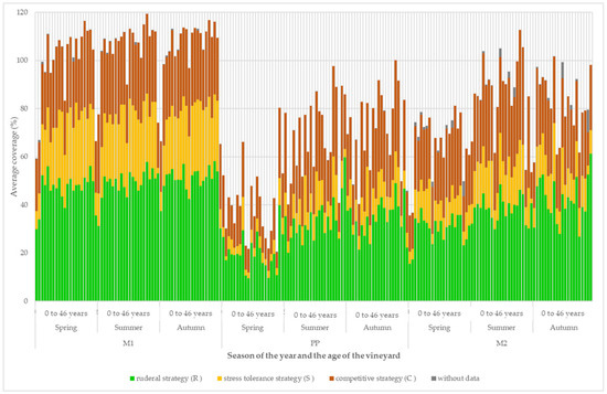 The development of the coverage of the plant groups according to their ecological strategy is shown in Figure 7. In the grassy inter-row (M1) in vineyards aged up to 4 years, there was a stable ratio between the three basic strategies, with a slight predominance of the ruderal strategy. There was a markedly lower proportion of species with a stress-tolerant strategy in the strip area around the grapevine trunks. In the cultivated inter-row (M2), there was also a lower share of species with a stress-tolerant strategy and a stronger predominance of species with a ruderal strategy.