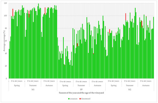 The number of plant species increased statistically significantly in the grassy inter-row (M1) with the age of vineyards. The number of plant species also increased statistically significantly in the strip area around the grapevine trunks with the age of the vineyard, but only during the summer season. In spring and autumn, the differences were not statistically significant. The changes in the number of plant species in the cultivated inter-rows were not statistically significant (Figure 3).